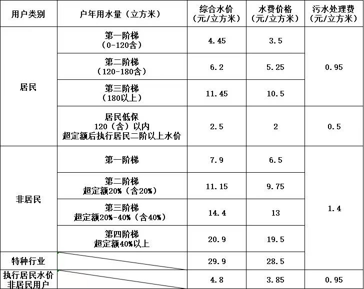 承德供水水費單價標準表