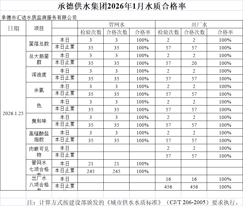 承德供水集團2026年1月25日水質(zhì)合格率